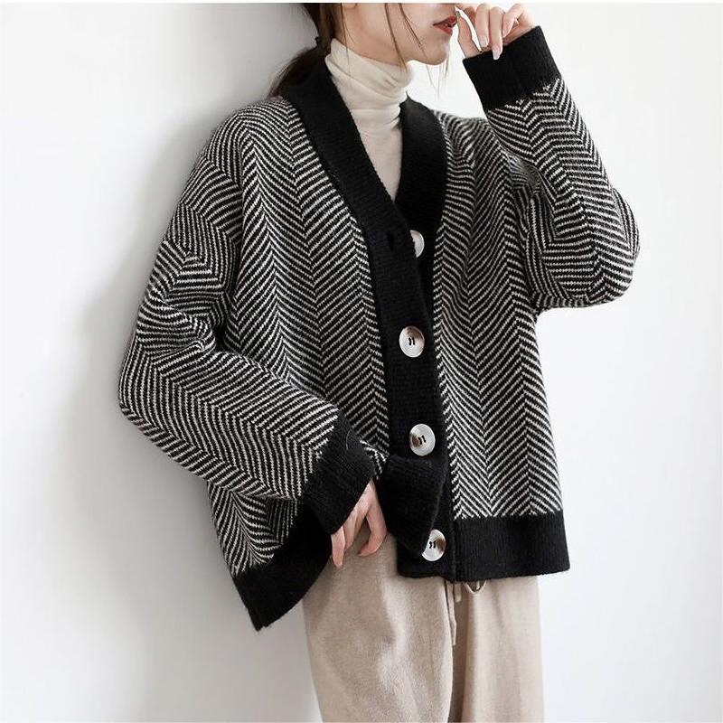 Осенний винтажный вязаный кардиган для женщин в полоску в стиле Idle из толстой грубой пряжи, универсальная верхняя одежда, свитер