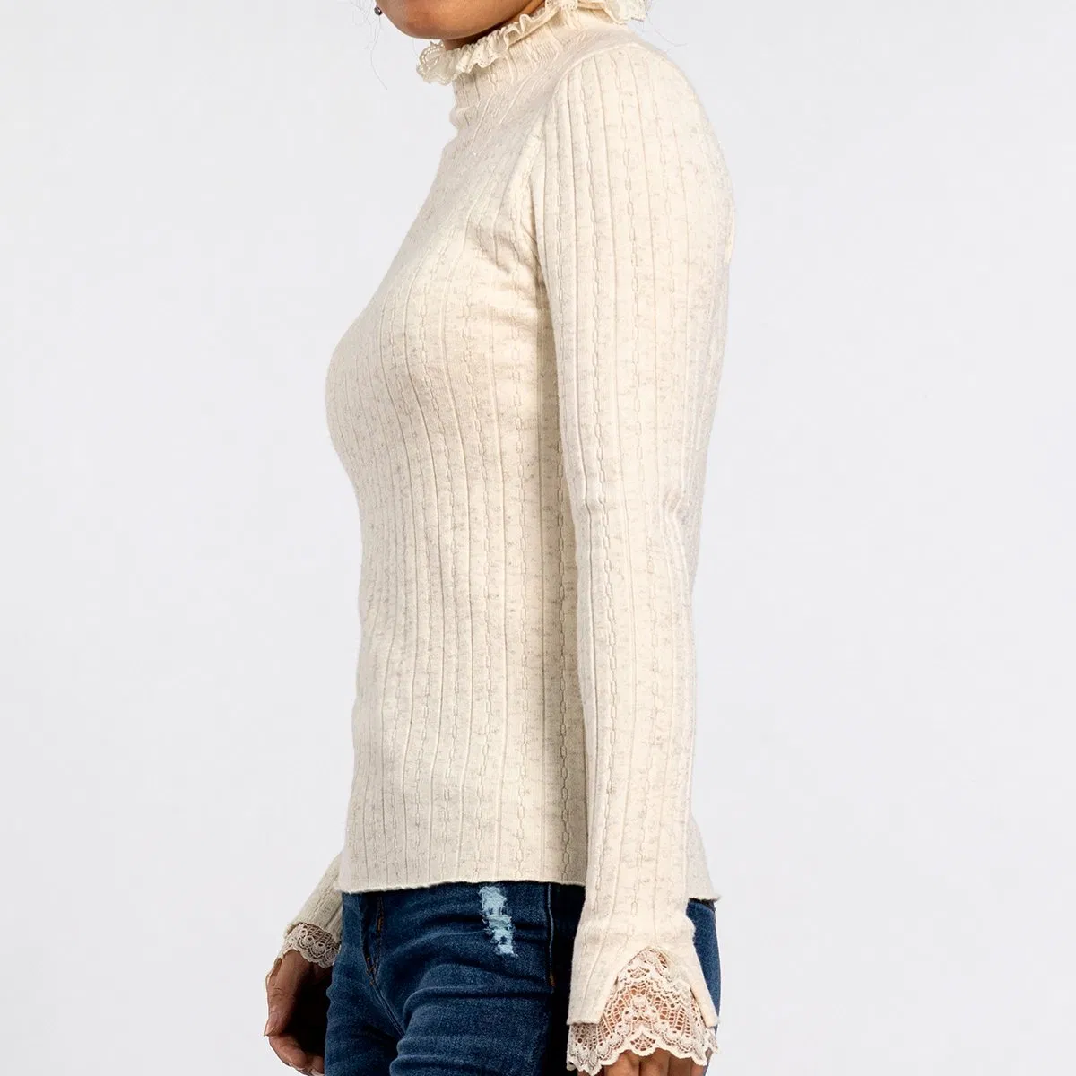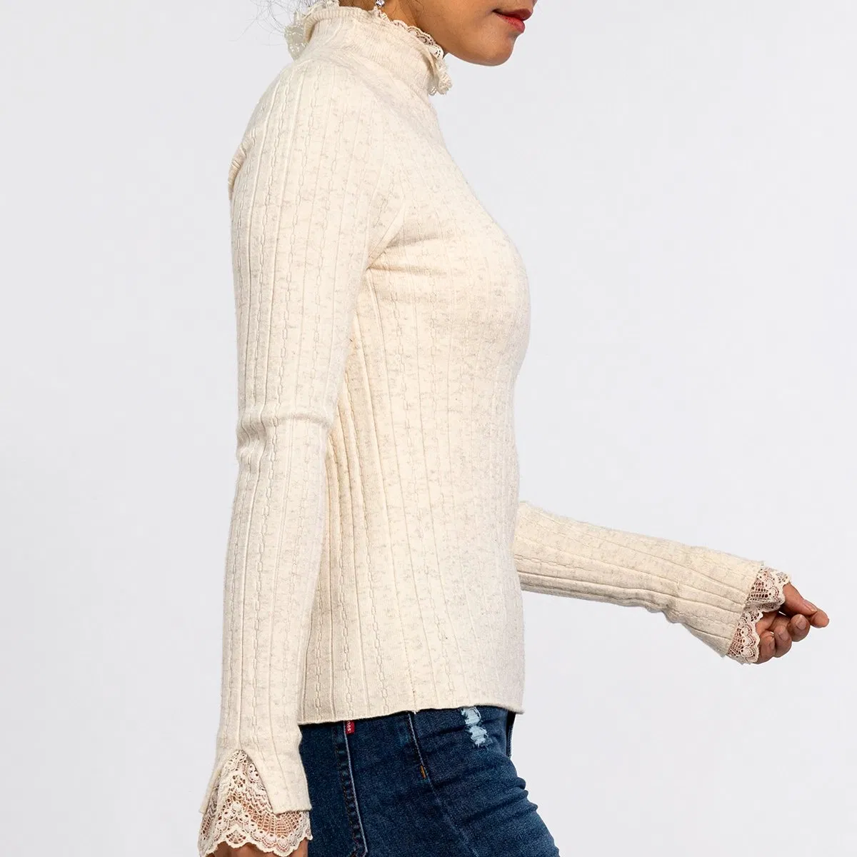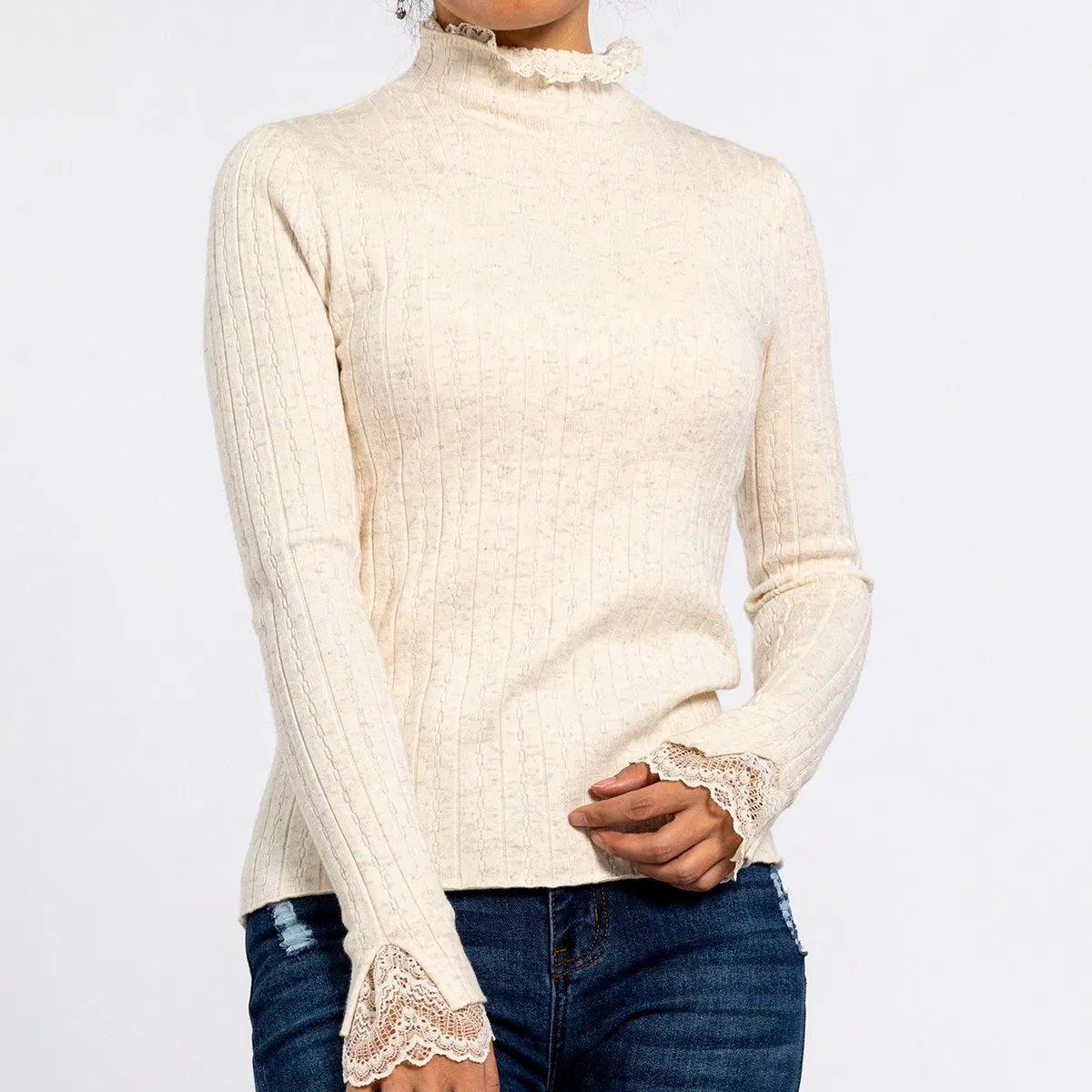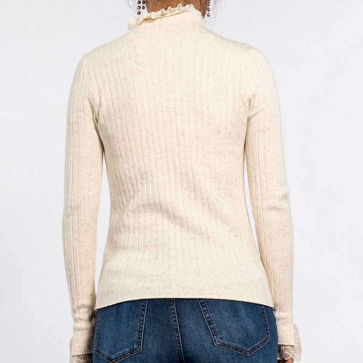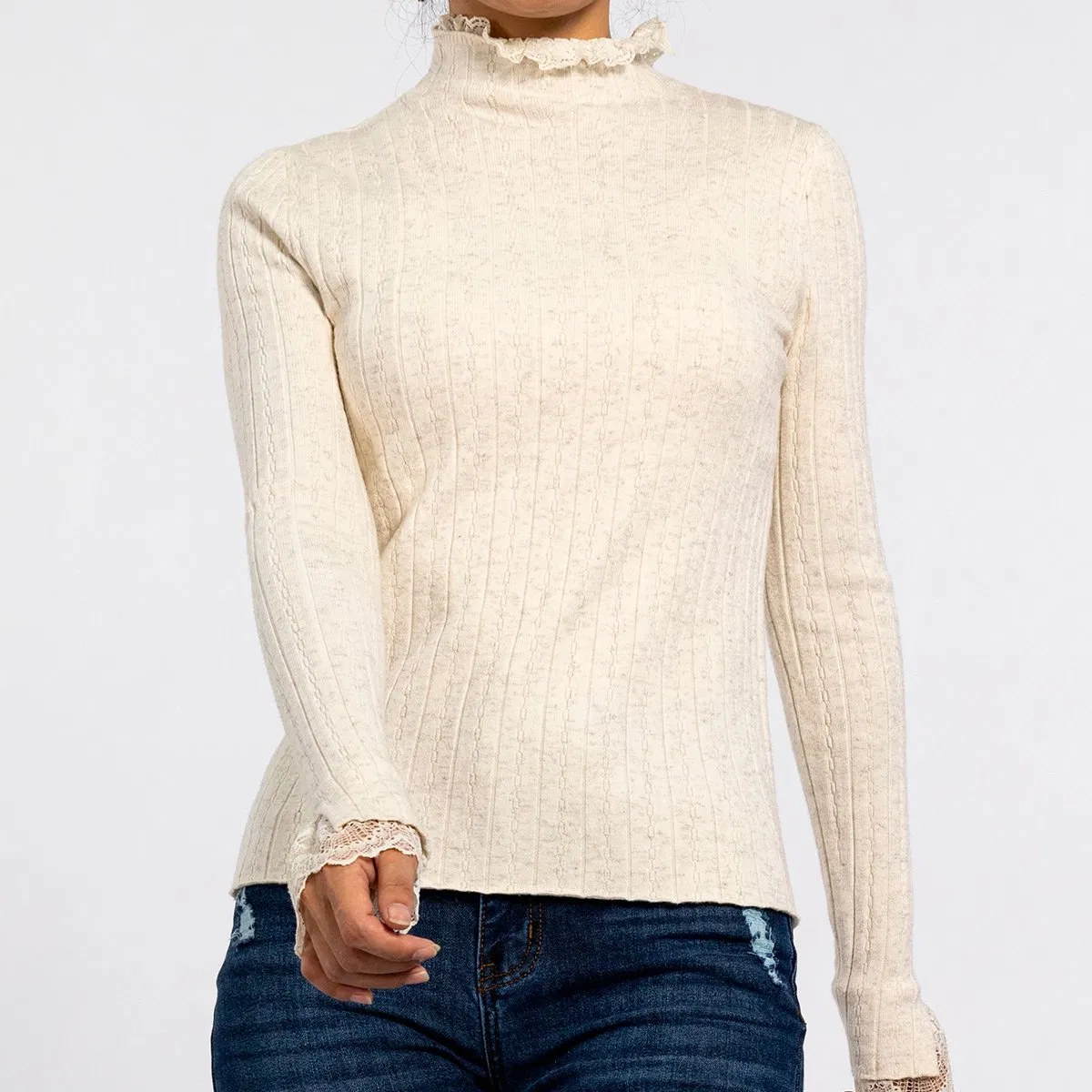 Осенний вязаный топ с высоким вырезом и кружевными оборками, пуловер с длинным рукавом, женский свитер